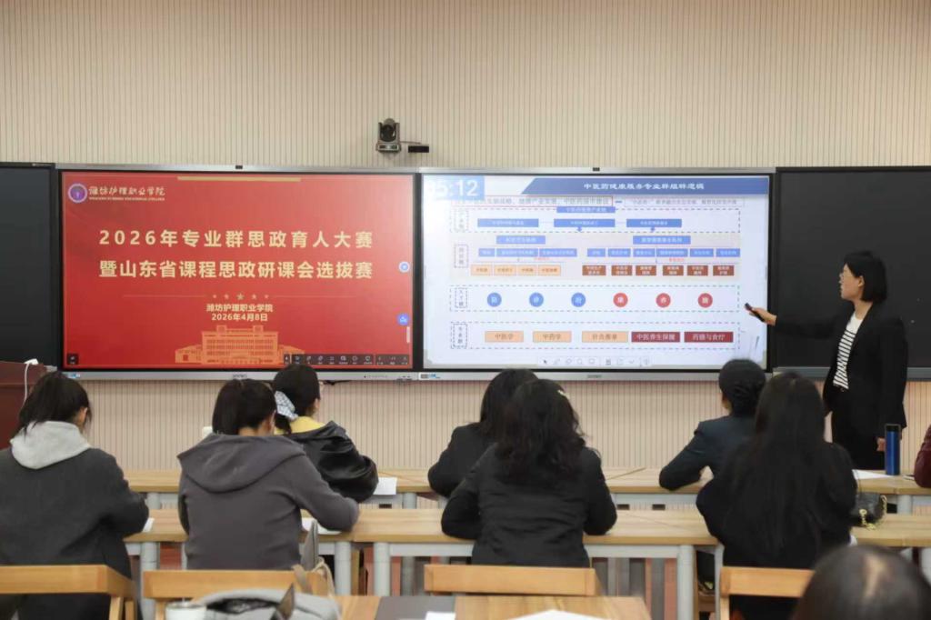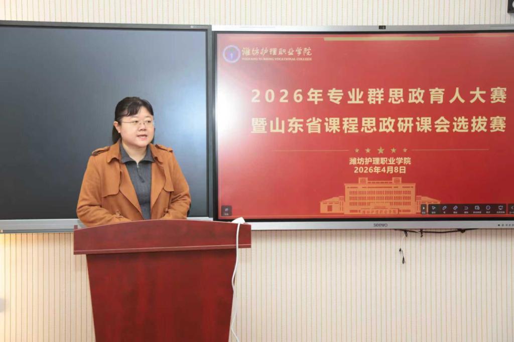 为深入学习贯彻习近平新时代中国特色社会主义思想,全面落实立德树人根本任务,进一步推进学校专业群思政、专业思政和课程思政协同建设,健全“专业群—专业—课程”一体化思政育人体系,4月8日上午,潍坊护理职业学院2026年专业群思政育人大赛暨山东省课程思政研课会选拔赛在图书馆103教师成长研习坊举行。